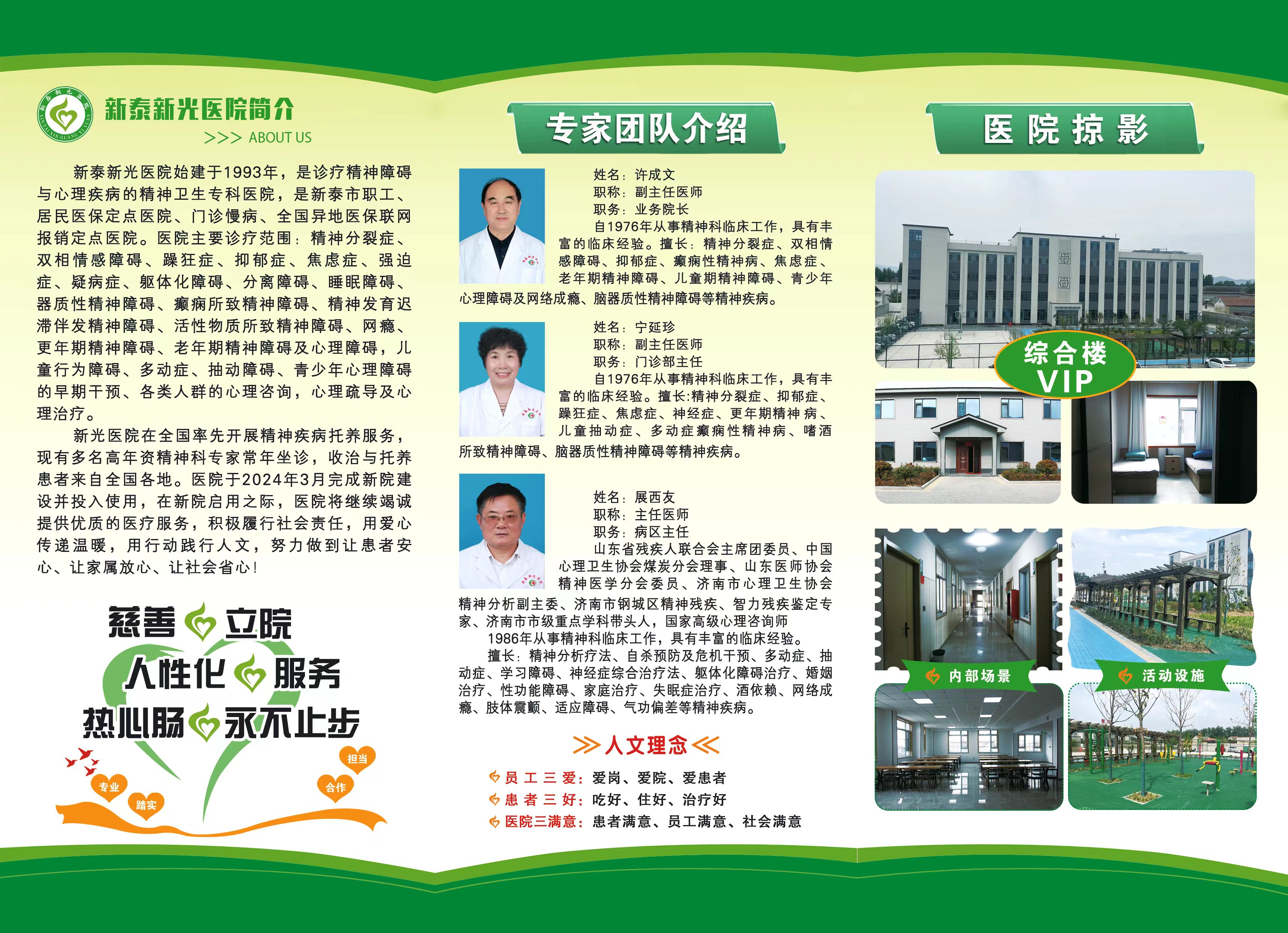 ◆精神医学、康复医学、中西医结合专业医院,下设精神科、临床心理科、癫痫科、中医科;;◆坐落于泰山脚下,山东省新泰市;◆宗旨 “慈善立院”,让百姓看得起病、让患者家庭解除负担 。◆患者来自 山东、北京、上海、天津、黑龙江、吉林、辽宁、河南、河北、安徽、湖南、湖北、广东、江苏、浙江、云南、内蒙、青海、新疆等30个省 (均有住院协议证实)